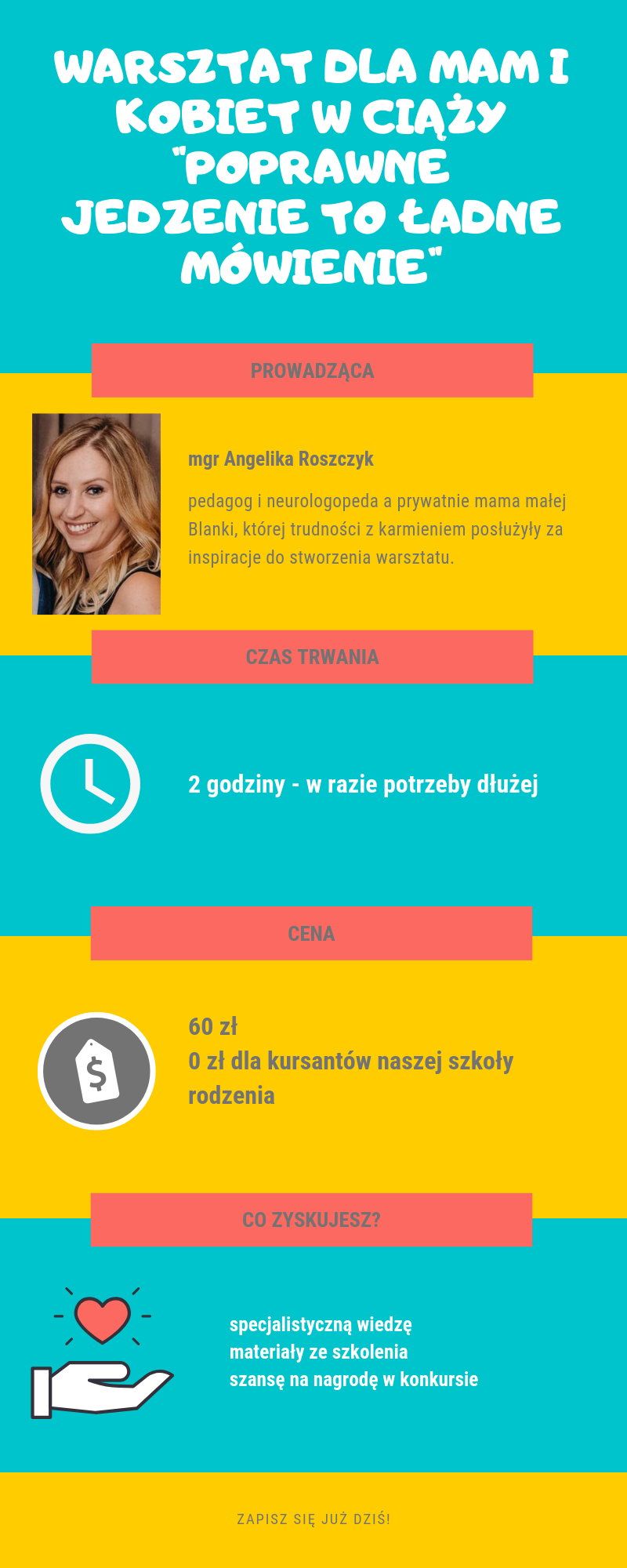 Warsztaty zostały stworzone z myślą o przyszłych mamach i wyzwaniach, jakie czekają je w pierwszym roku macierzyństwa. Są idealnym uzupełnieniem wiedzy zdobytej w szkole rodzenia. Zostały stworzone przez neurologopedę i pedagoga Angeliką Roszczyk – prywatnie mamę małej Blanki, której problemy z karmieniem stały się inspiracją do ich powstania.